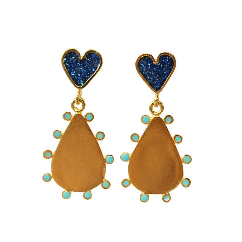 Aretes con topo de corazón de 1cm y gota de 2cm dorada.