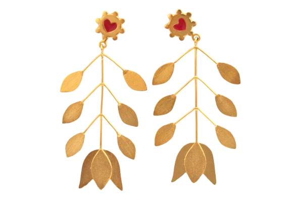 Aretes en forma de rama con tulipan y topo corazon, elaborado en bronce con baño de oro de 24k